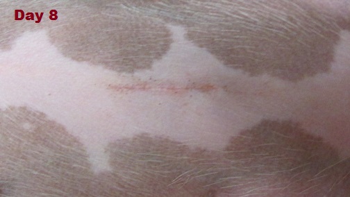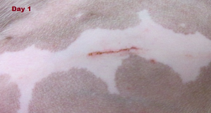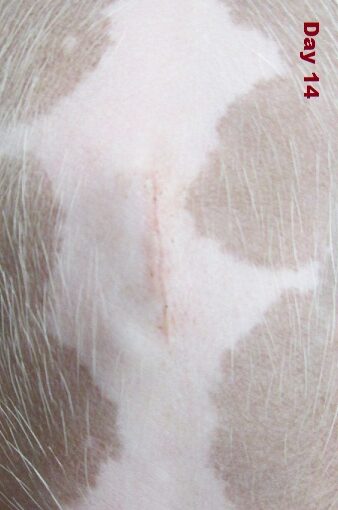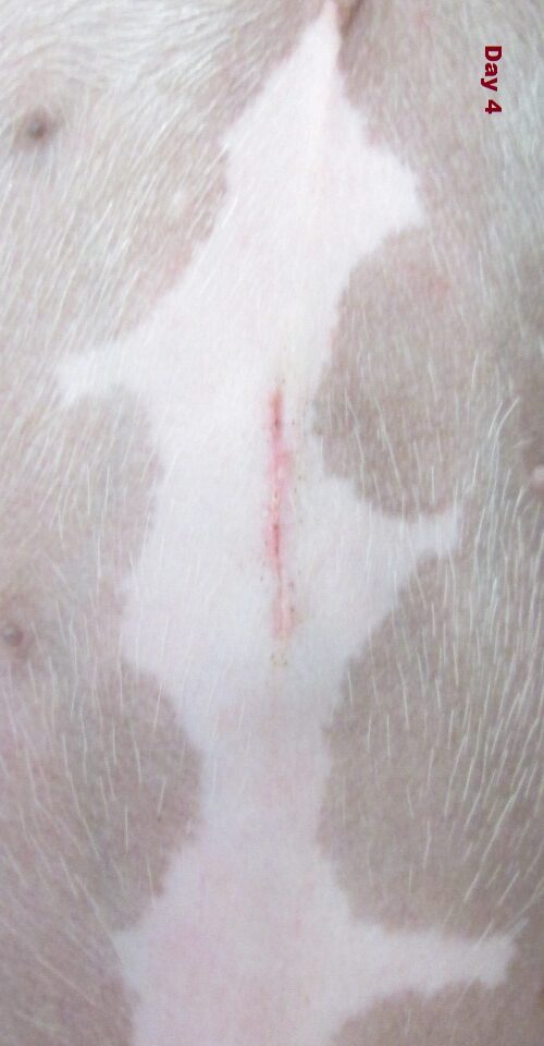 Below are pictures of what to expect from a typical spay incision with the use of the CO2 Surgical laser during surgery and Cold laser after surgery. This incision was from a 5 month old 20 pound dog. The incision is approximately 1.5 – 2 inches in length.